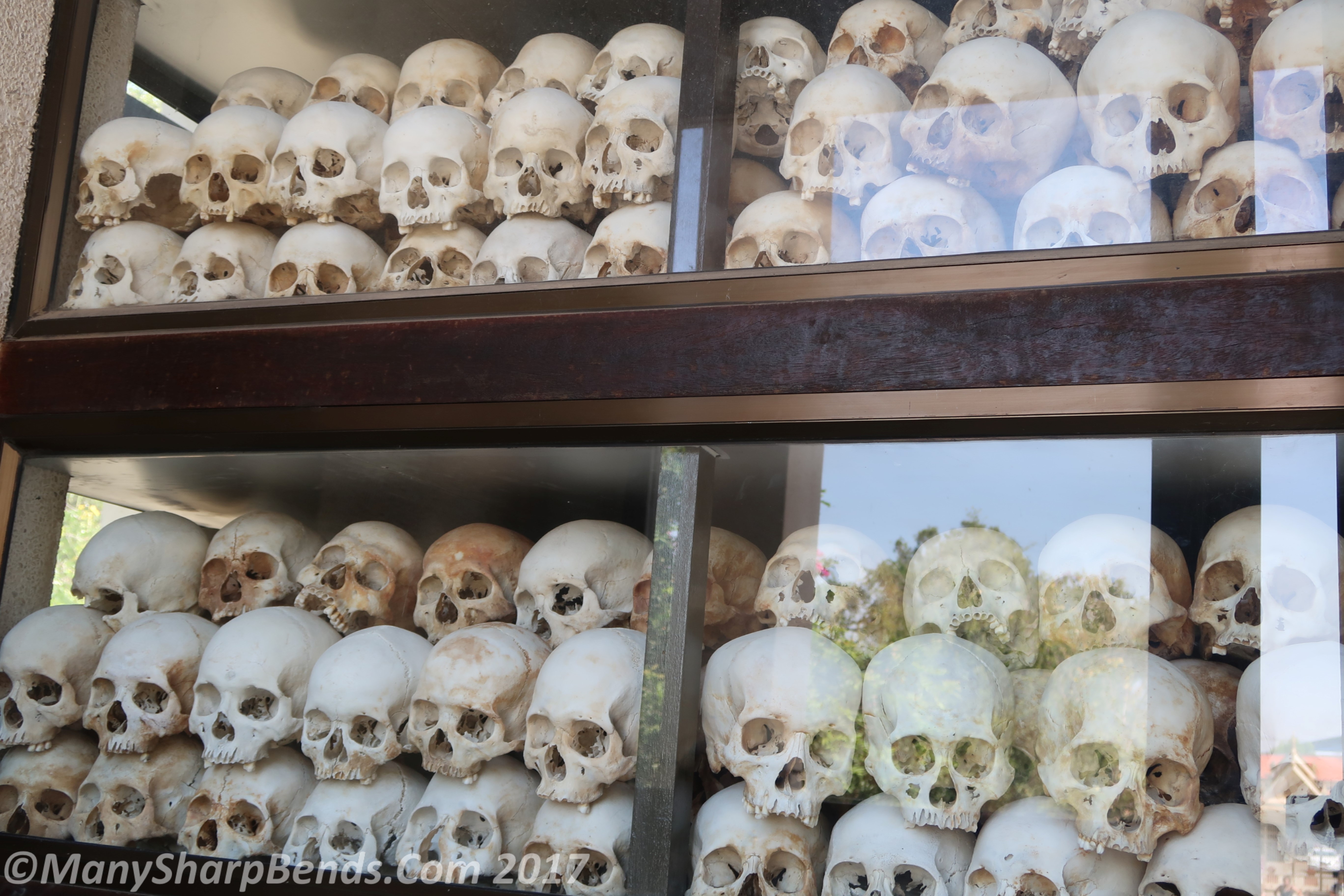 The Cambodian civil war in 1975 was won by the communist Khmer Rouge – an organization with the flawed and demented vision of turning Cambodia into a giant agrarian society in which there was no place for education, religion, sports, entertainment and intellectuals. They were led by Pol Pot – the deranged leader who was inspired by Maoist ideas during his education in Paris. The genocide that he inflicted on his own people (2 million out of 8 million total population were executed) in the name of social re-engineering is a chilling example of how countries can be doomed under mad, unbalanced, one-sided leadership. The recruits were poor 15 year olds from the countryside who had no idea what they were fighting for. The population was divided into “new folks” (city dwellers) – the bad guys and “old folks” (village dwellers) – the good guys. If you belonged to the former category, you were doomed. All cities including the capital Phnom Penh were evacuated within 3 days and everyone was forced to the countryside where they had to work in fields for 12-15 hours a day under inhuman conditions. Factories, schools, transport, religious structures, offices, stadiums – were considered “evil” and destroyed. Educated folks (doctors, engineers, musicians, lawyers.. you name it) were brought to torture centers like this, imprisoned, interrogated, forced into false admissions and then executed. If you wore glasses – a visible sign of “urban excess” – you were automatically doomed ! Crazy stuff. 20,000 prisoners died here alone at this school-turned-prison and when KR run out of graves , prisoners were sent to the killing fields. It all sounds too horrifying to describe and we were moved to tears constantly.